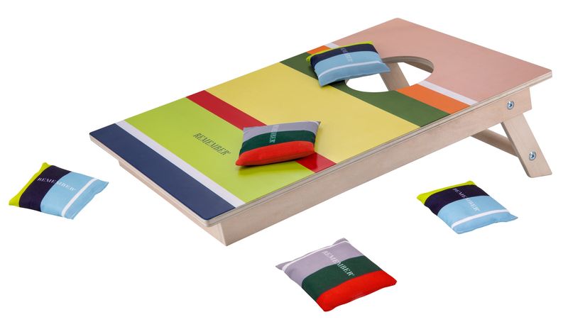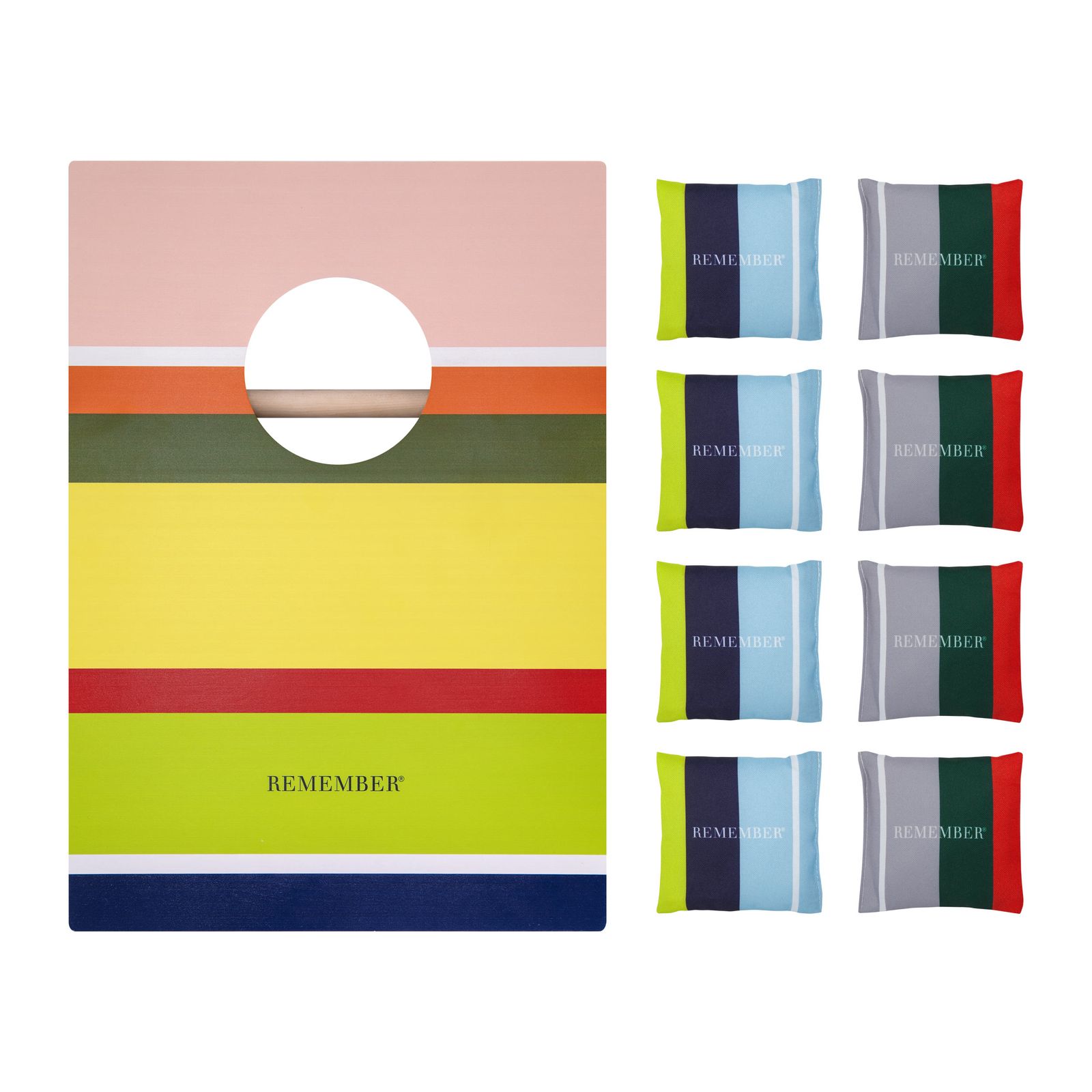 Seit der Gründung stehen für die Firma Remember Farben und Formen im Vordergrund. In dem ausgefallenen außergewöhnlich und originellem Sortiment finden Sie Geschenkartikel für den Wohnbereich, Tisch + Küche, Büro, für die Reise, Spiele für Groß und Klein sowie modische Accessoires. Das farbenfrohe CORNHOLE von Remember bringt jede Menge Spielspaß, egal ob zur Grillparty, Familienfeier oder Campingtrip – dieses Spiel sorgt garantiert für gute Laune und spannende Matches für 2–4 Spieler. Bereit für Action, Spaß und eine Portion Wettbewerb? Ziel ist es, die Wurfsäckchen punktgenau auf das Board oder ins Loch zu werfen – 3 Punkte für einen Volltreffer, 1 Punkt für die Fläche. Nicht immer einfach, aber immer ein Riesenspaß!