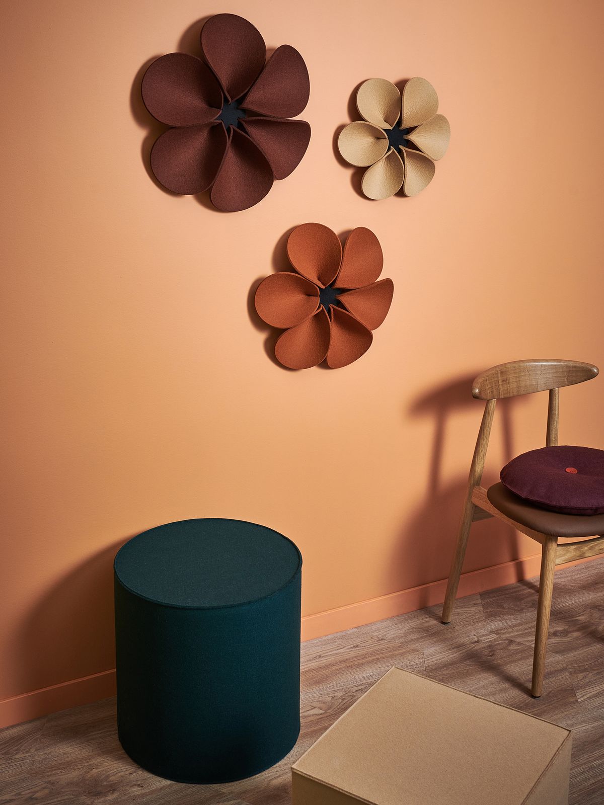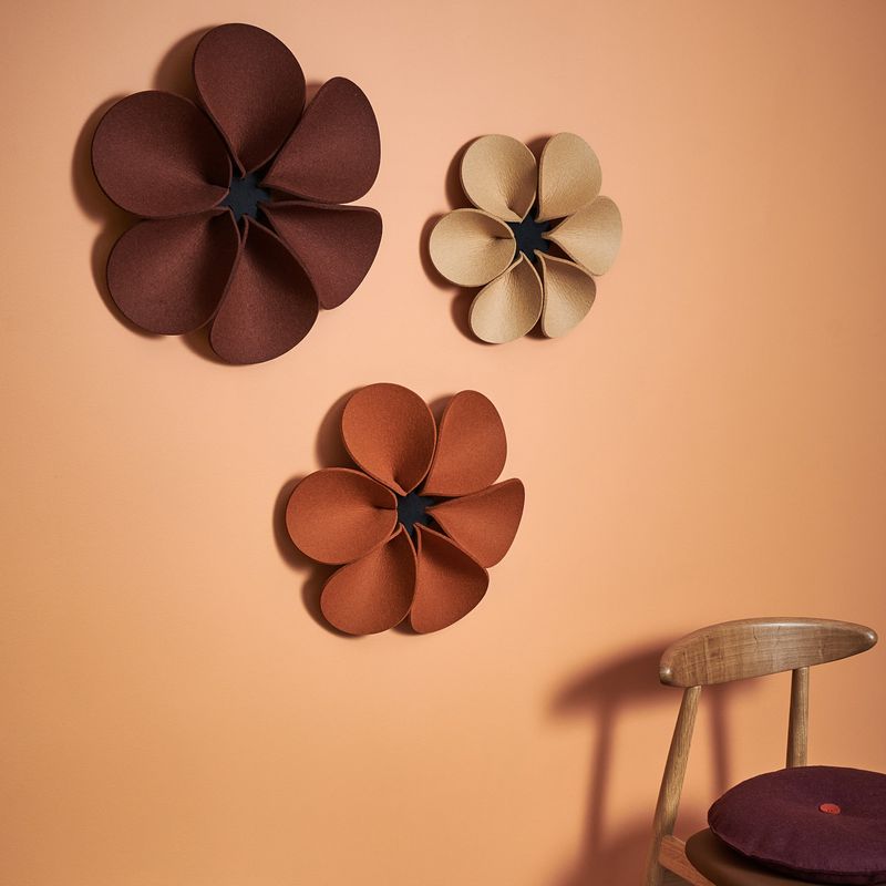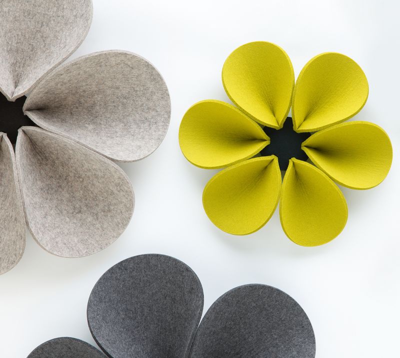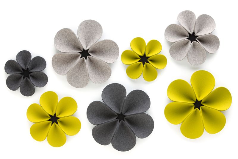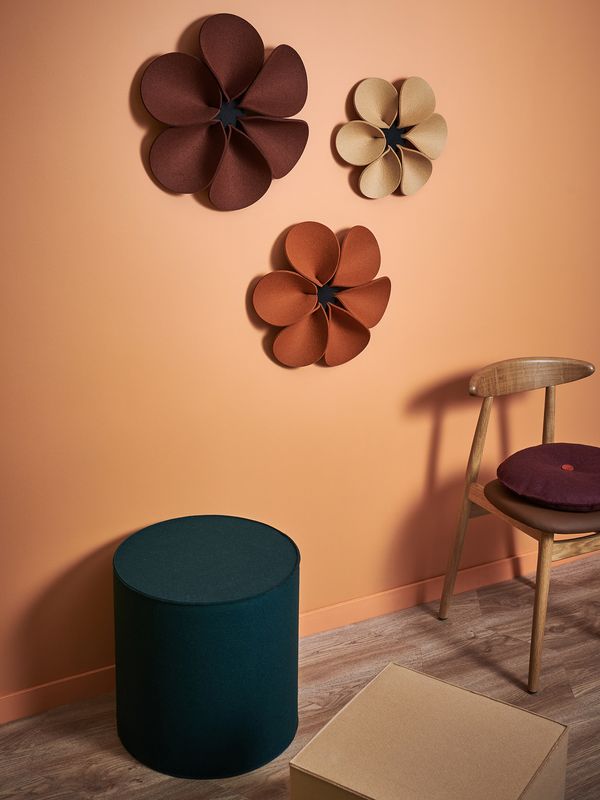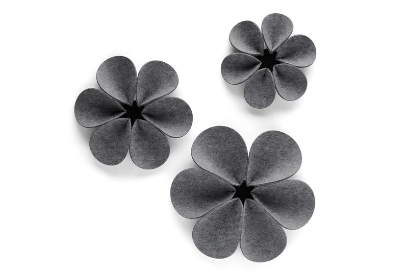 Geht es um Gestaltung von individuellen Lebens- und Arbeitsbereichen, ist Filz ein ideales Material. Das Wandelement Bloom strahlt eine angenehme Ruhe aus. Sie nehmen durch ihre erhabenen, in sich gebogenen Blütenblätter aus 5 mm starkem Filz den Schall auf. Die 3 aufeinander abgestimmten Größen ergeben ein dekoratives Wandbild, das sowohl einfarbig als auch in bunten Farben eine außergewöhnliche Anmutung hat und jederzeit ergänzt werden kann. Das Wandelement Bloom ist ebenfalls im 3er-Set in S-M-L erhältlich. Das Wandelement wird an die Wand geschraubt. Die Blütenblätter sind gesteckt und austauschbar. Ein schallschluckendes und dekoratives Wandelement. Zum Einsatz im Objekt und in privaten Räumen geeignet.